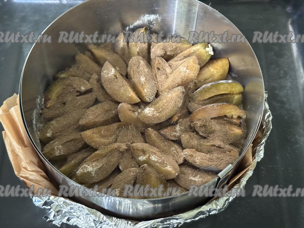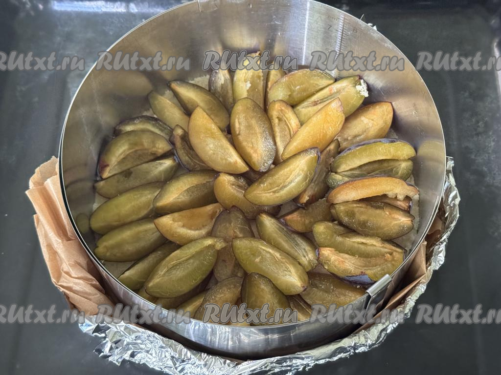 На песочную крошку выложить сливы ровным слоем срезом вверх.