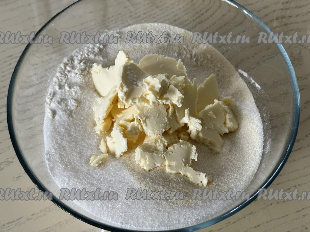 Перемешать сухие ингредиенты до однородности. Сливочное масло достать из холодильника, сразу нарезать на кусочки, выложить в миску с сухими ингредиентами.