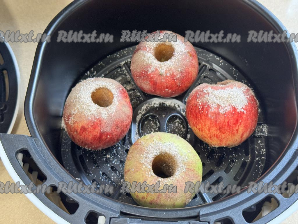 Выложить яблоки в чашу аэрогриля, присыпать сверху оставшейся смесью сахара и корицы.