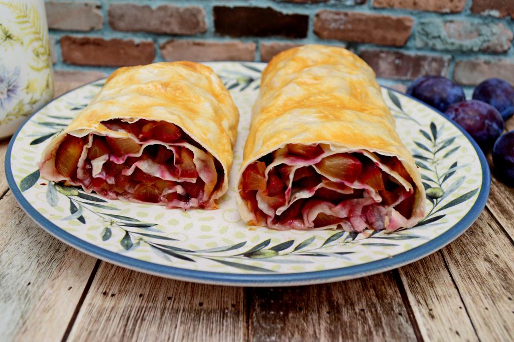 Готовый штрудель вынуть из духовки, остудить и можно нарезать на кусочки острым ножом. Любители слив в выпечке будут в восторге, большое количество сливовой начинки и тонкое тесто из лаваша делают этот рулет невероятно вкусным.