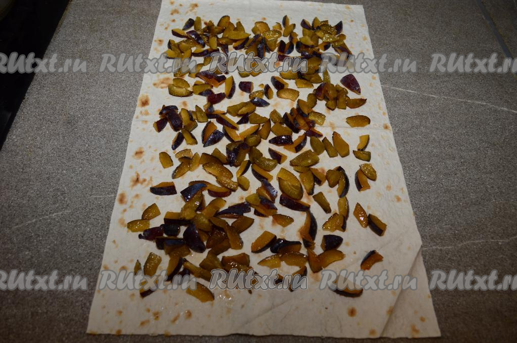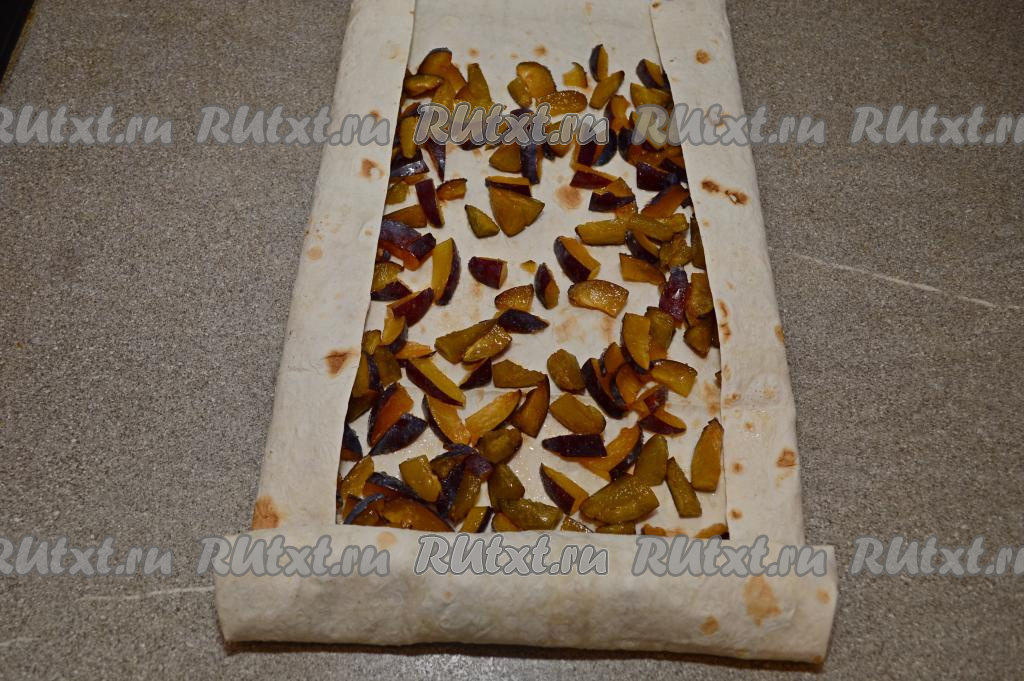 Подвернуть на начинку два длинных края. И, начиная с узкого края, свернуть лаваш со сливами в плотный рулет.