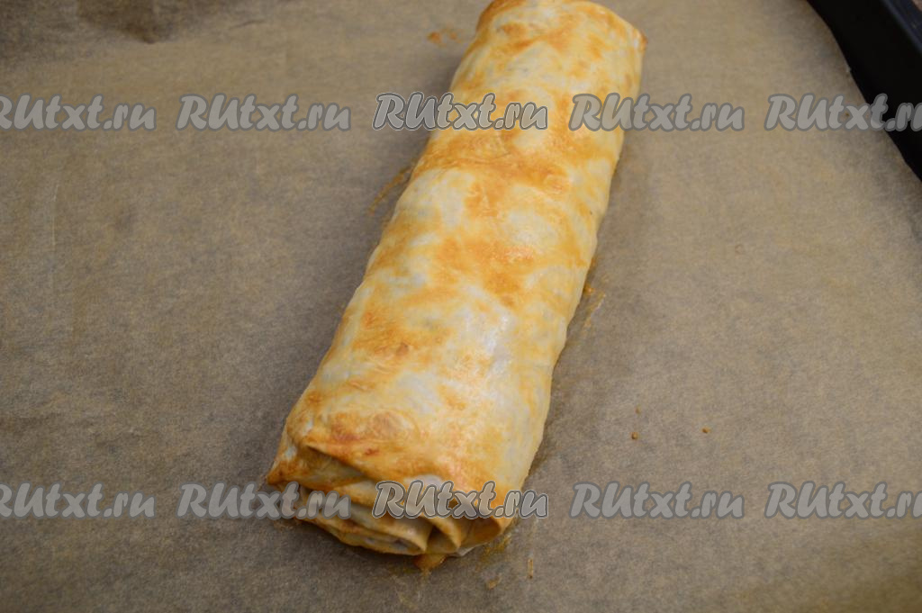 Переложить рулет из лаваша на противень, застеленный пергаментом.