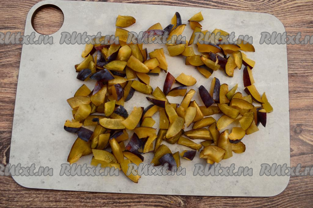 Сливы вымыть, удалить косточки. Нарезать сливы на средние кусочки, очень мелко можно не нарезать.