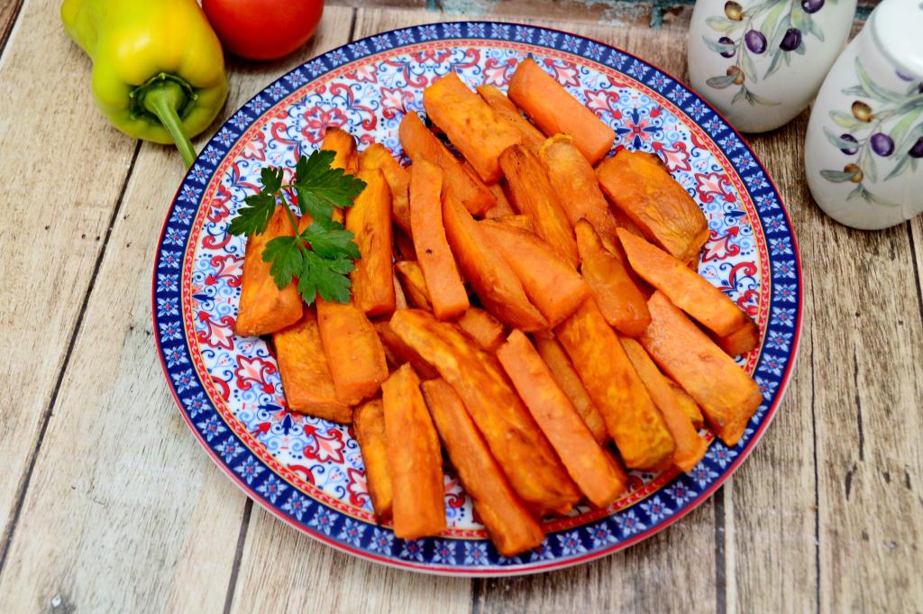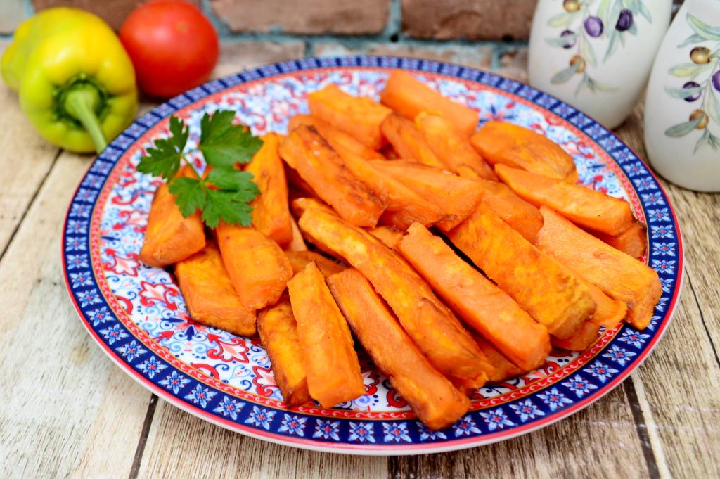 Батат получается с хрустящей корочкой снаружи и нежной мякотью внутри. Несмотря на то, что батат сладковатый, этот жареный овощ по вкусу очень напоминает картошку фри.