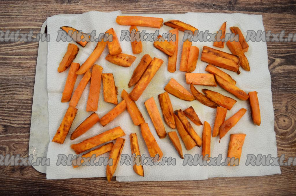 Готовый жареный батат переложить со сковороды на бумажные салфетки, чтобы удалить излишки масла.