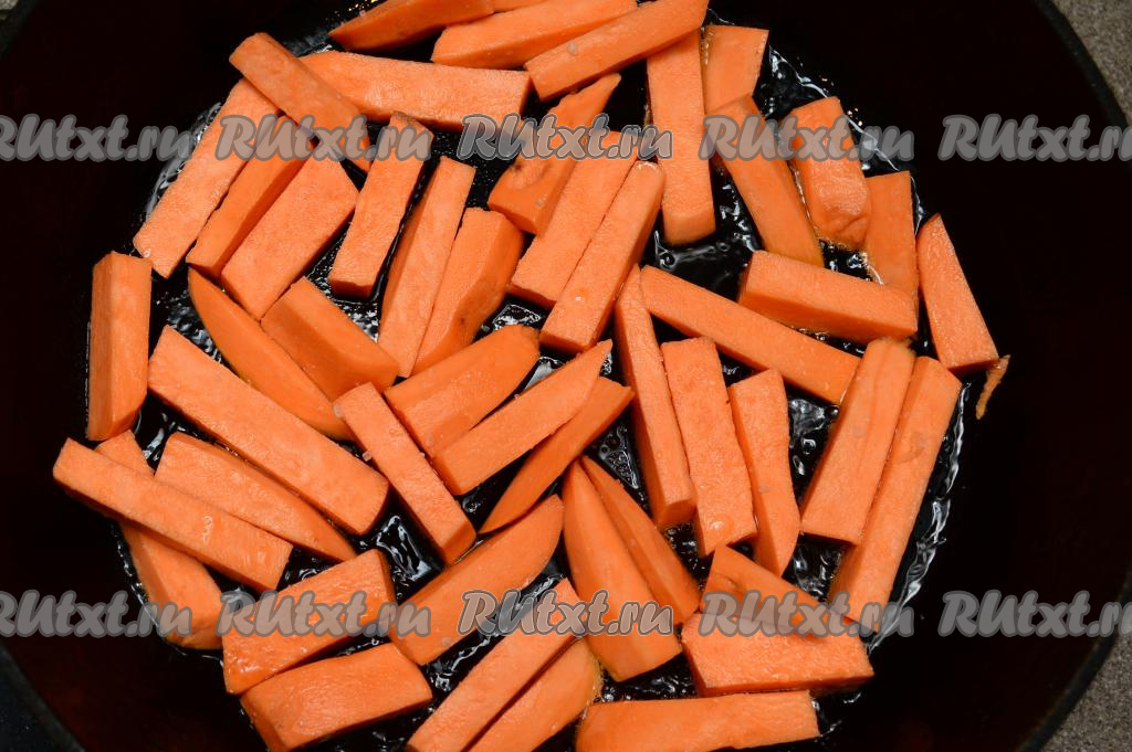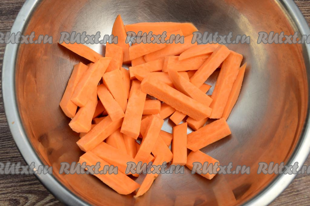 Нарезать батат на примерно одинаковые брусочки толщиной около 1 сантиметра.