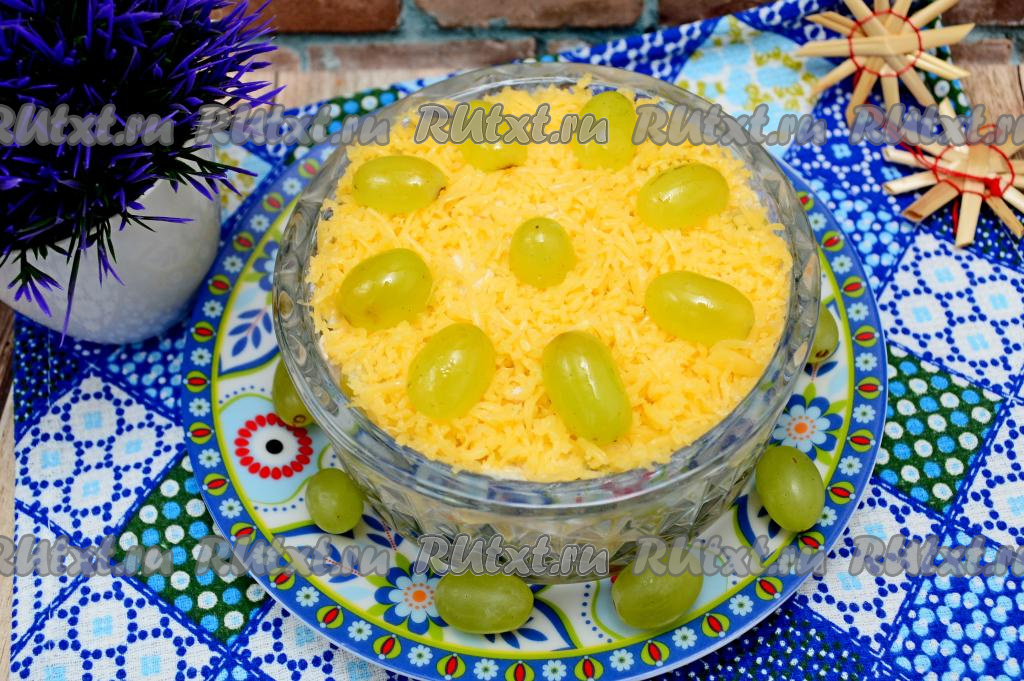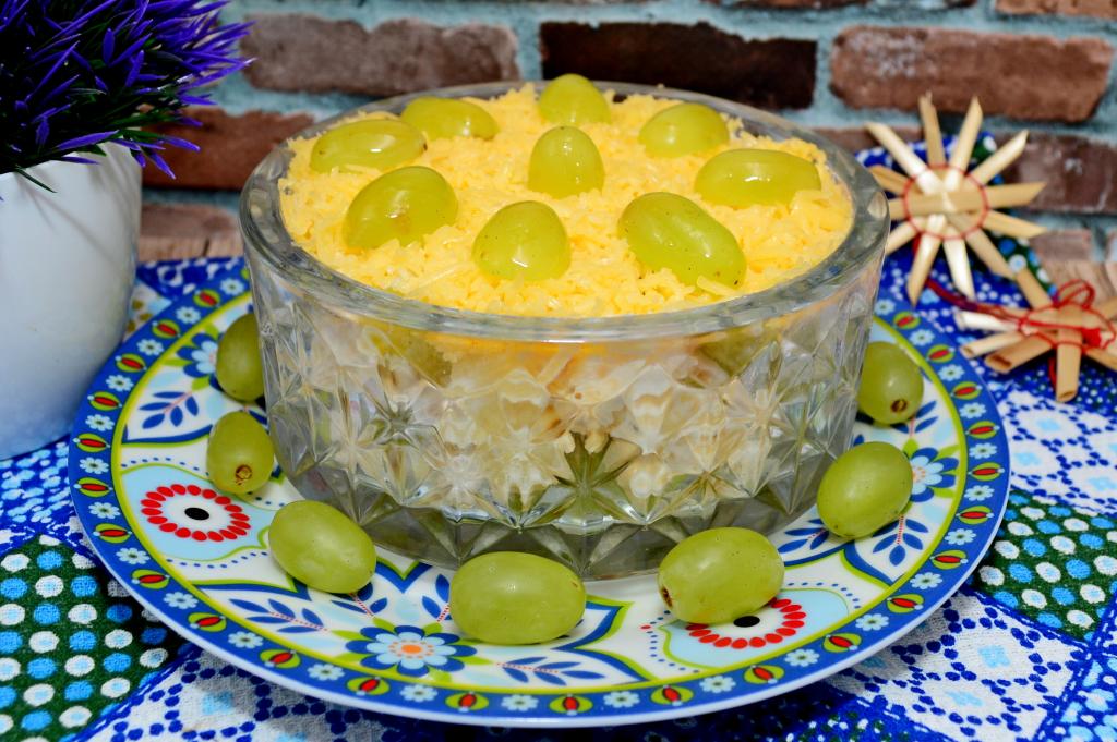 Салат "Французский салат" выложить в салатник, в котором вы будете подавать его к столу. Сверху присыпать отложенным ранее натёртым сыром. Украсить половинками винограда в виде цветочка и можно подавать к столу.