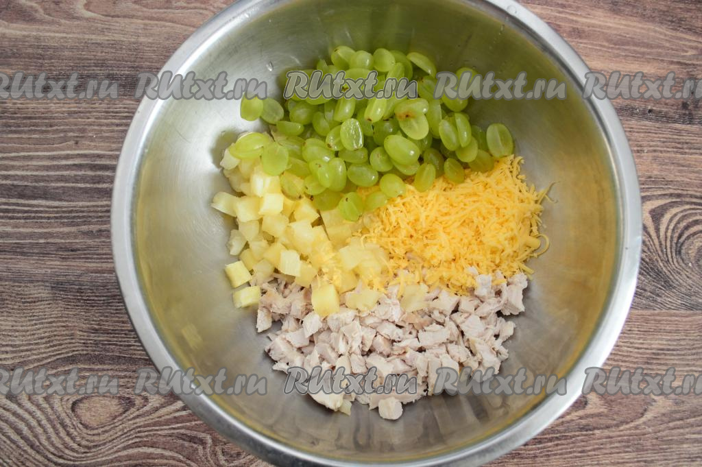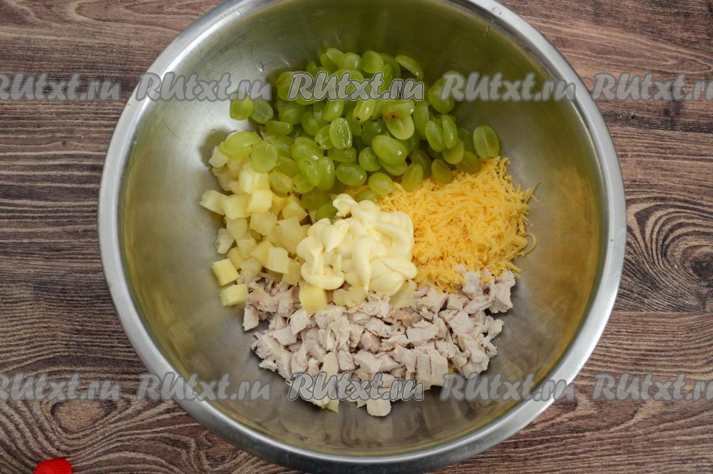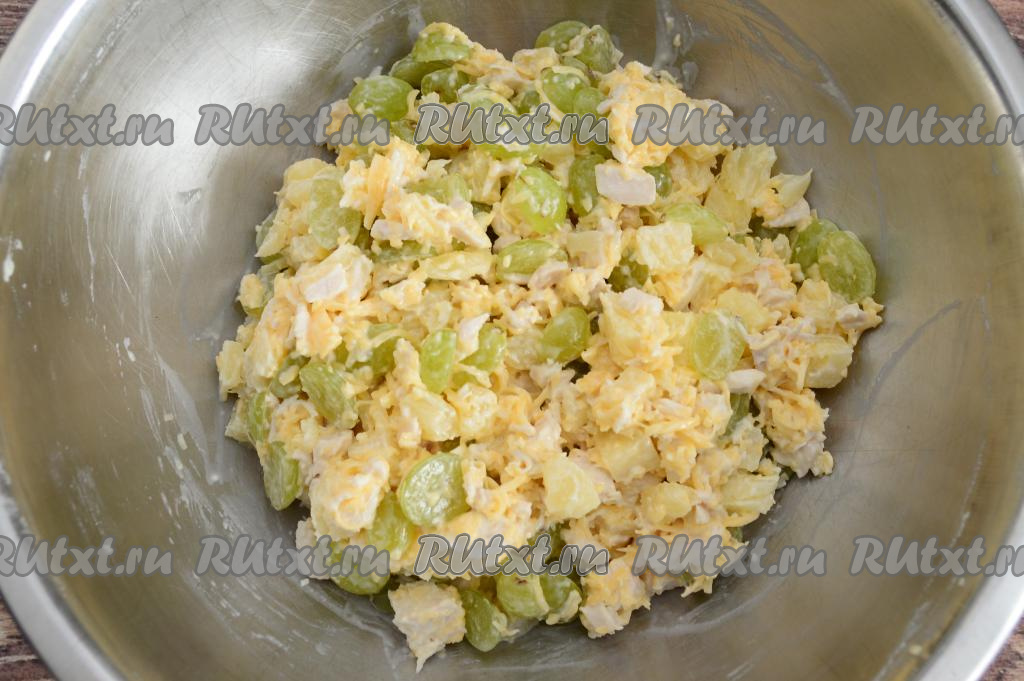 В миску с натёртым сыром добавить куриное мясо, ананасы, виноград и пропущенный через пресс чеснок. Несколько половинок винограда отложить для украшения.