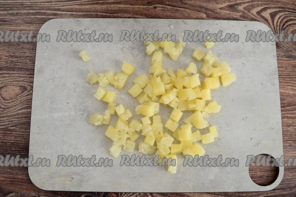 Консервированные ананасы тоже нарезать на мелкие кусочки.