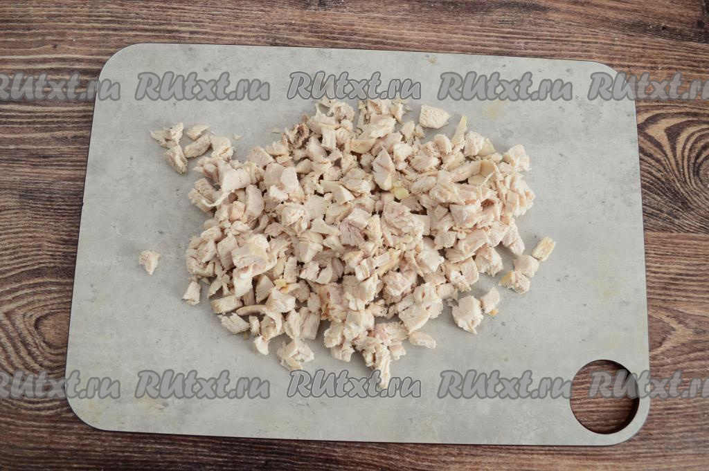 Варёное куриное мясо нарезать на мелкие кубики.