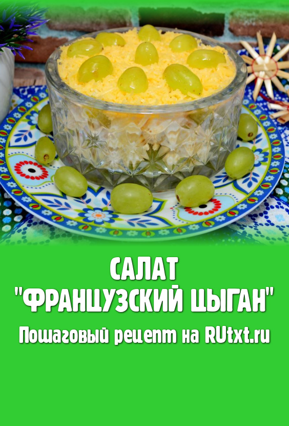Салат "Французский цыган", приготовленный с виноградом и ананасом, получается очень сытным, сочным и конечно же вкусным. Это блюдо можно подать на любой праздничный стол.