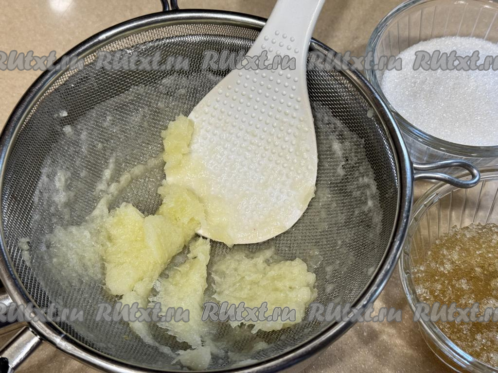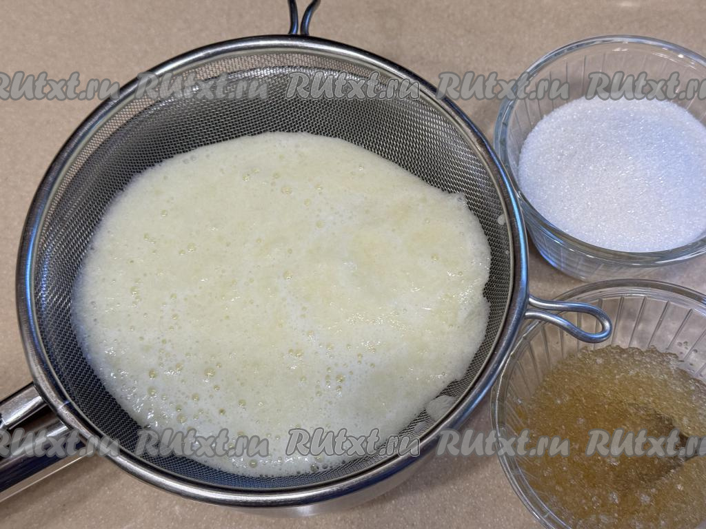 В результате перетирания в сите останется жмых, который нам не понадобится. А в кастрюле будет процеженное однородное пюре из дыни.