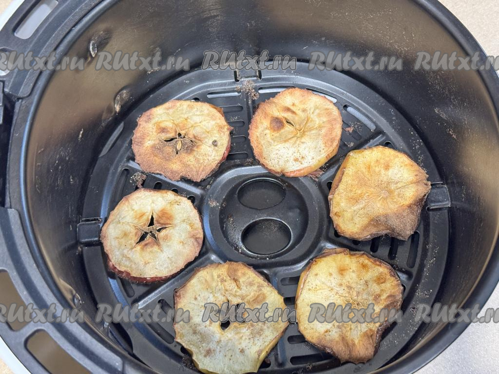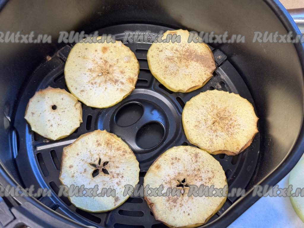 По окончании 10 минут перевернуть кружочки яблок и запекать в аэрогриле при 180 градусах ещё 5 минут.
