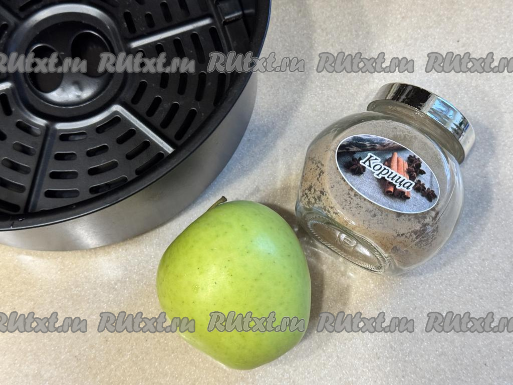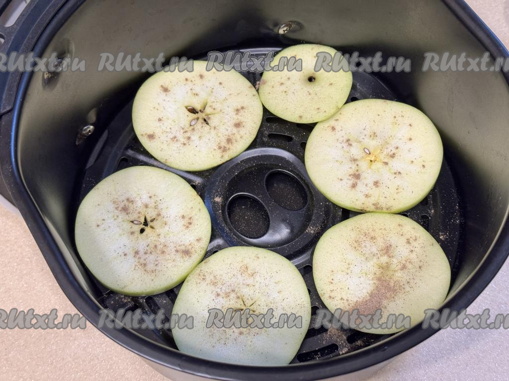 Кружочки яблок выложить в один слой в аэрогриль. По желанию, присыпать яблоки сверху корицей.