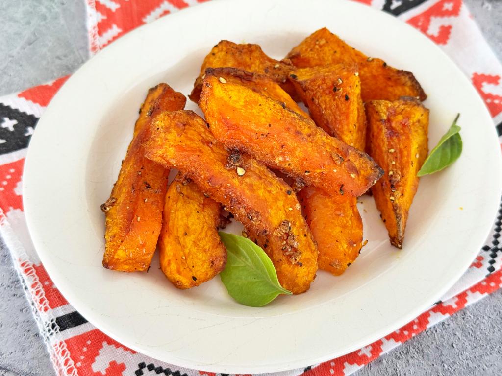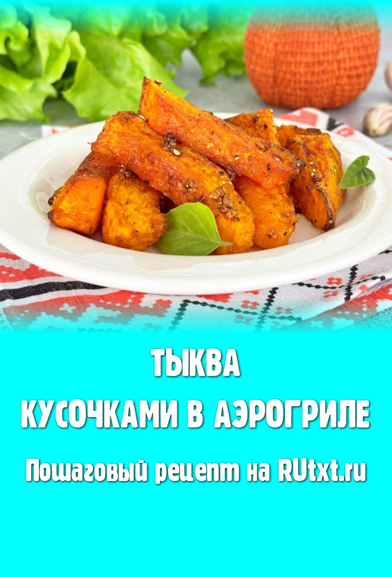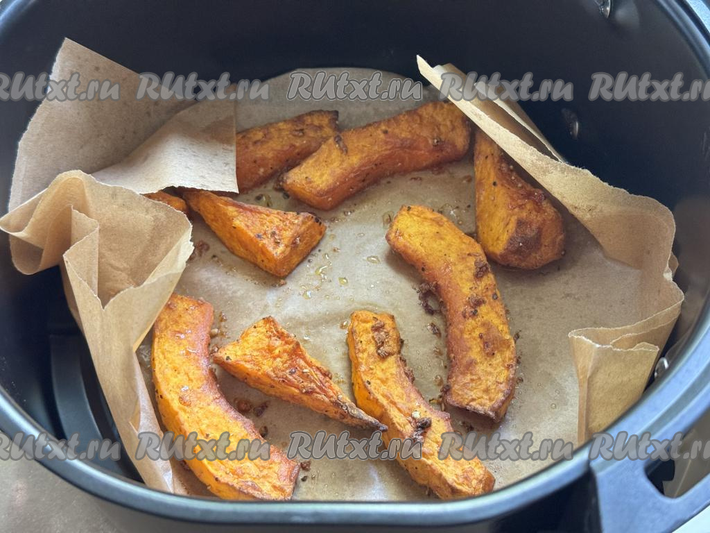 Запекать тыкву в аэрогриле при температуре 180 градусов в течение 25-30 минут (кусочки тыквы должны стать достаточно мягкими, легко прокалываться ножом). Если по истечении 25-30 минут тыква осталась твердоватой (многое зависит от сорта тыквы и толщины нарезки), тогда увеличьте время запекания на 5-10 минут.