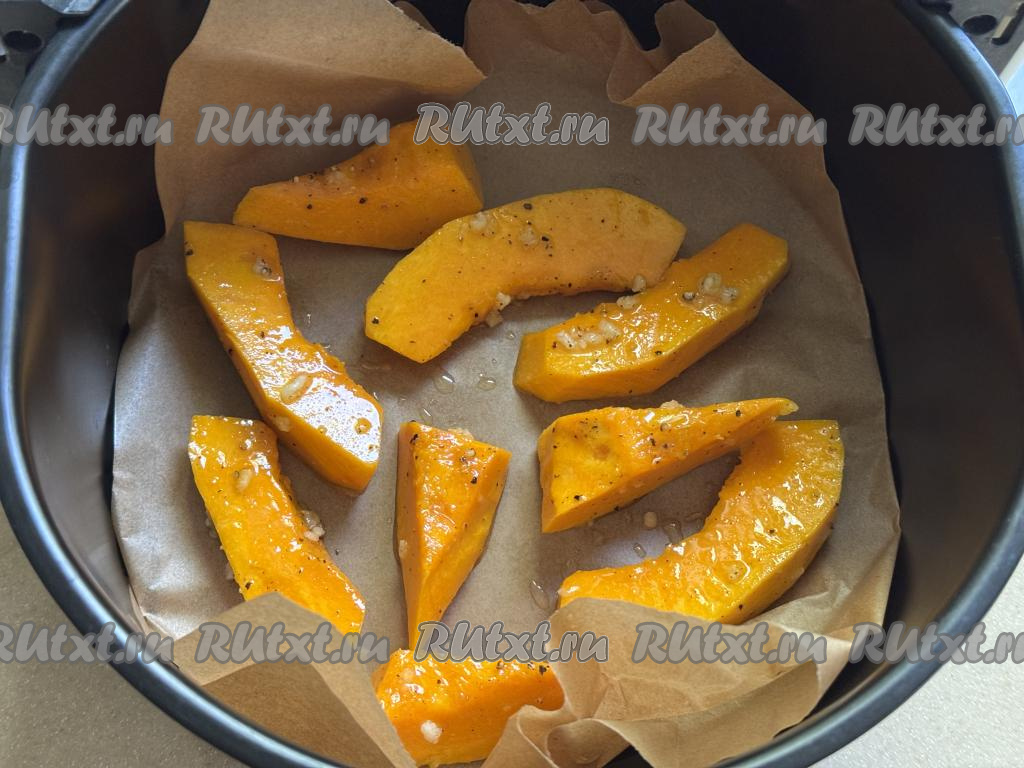 Дно чаши аэрогриля выстелить пергаментом. Выложить кусочки тыквы в чашу аэрогриля в один слой.