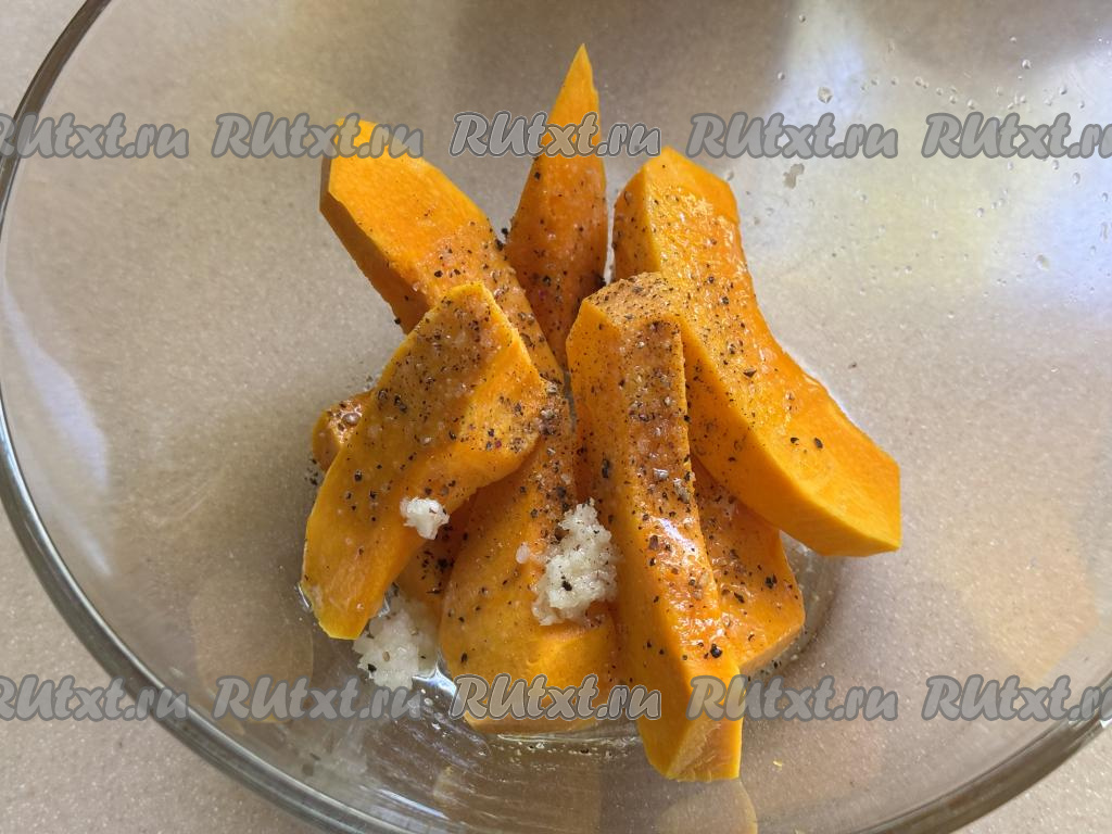 Выложить тыкву в миску, добавить пропущенный через пресс чеснок, соль и чёрный молотый перец, влить растительное масло. Хорошо перемешать, покрывая тыкву специями и маслом со всех сторон.