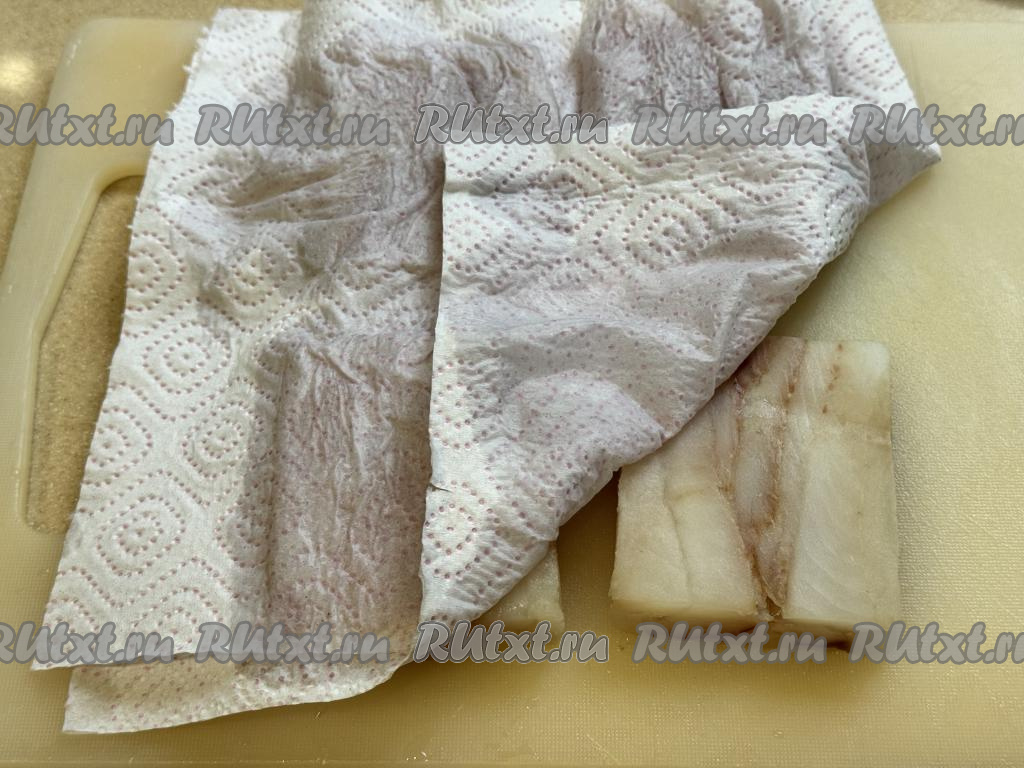 Размороженные кусочки минтая переложить на разделочную доску и обсушить бумажными полотенцами.