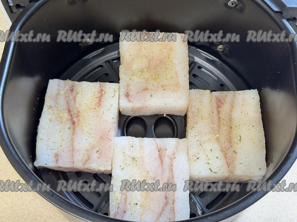 Переложить брикеты минтая в чашу аэрогриля в один слой.