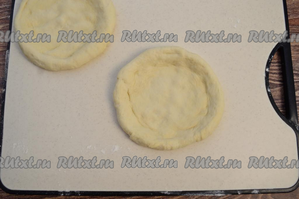 Затем руками на припылённой мукой поверхности начать формировать лепёшки. Для этого нужно взять одну часть теста и, начиная с середины заготовки, большим пальцем приминать тесто, формируя плоскую середину и небольшой бортик по краю лепёшки, как на фото.