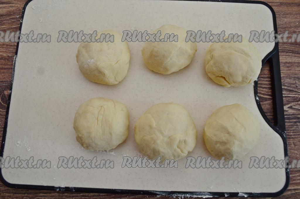 Поднявшееся тесто обмять и разделить на 6 примерно равных частей. У меня каждая часть весила 110-120 грамм.