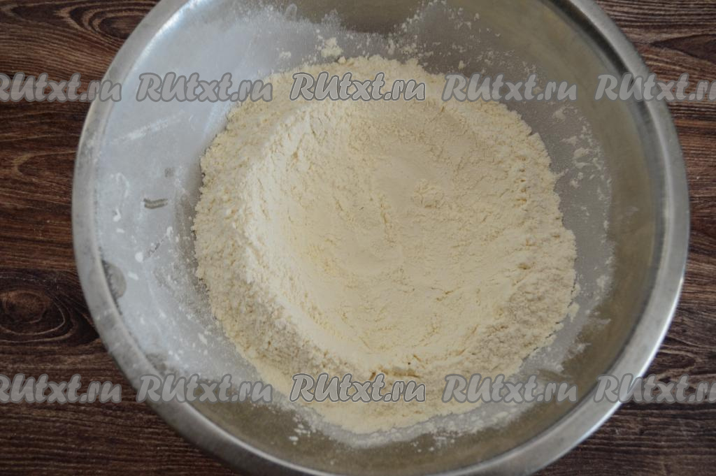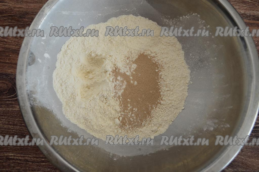 В глубокую миску всыпать 450 грамм муки и 1 чайную ложку сухих дрожжей.