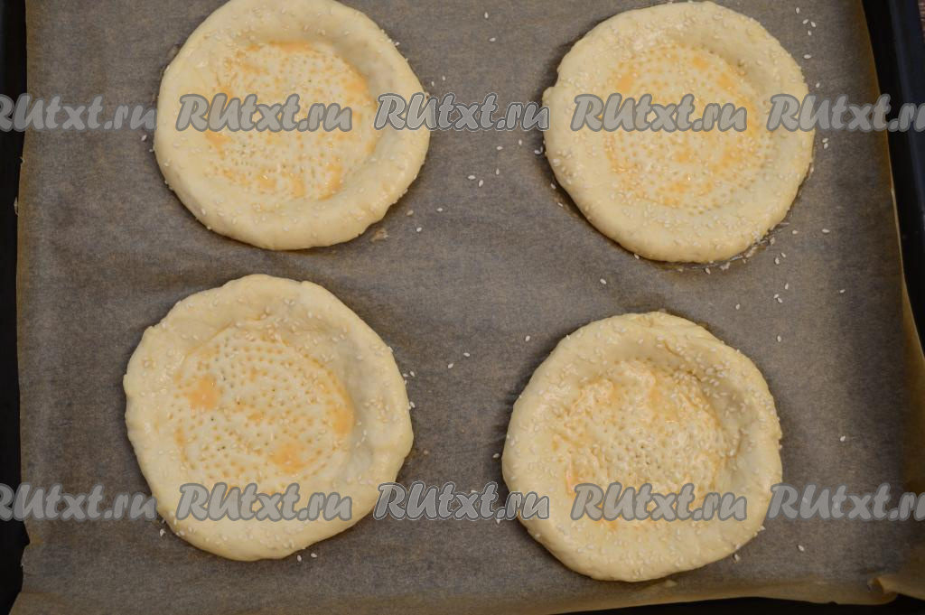 Таким образом сформировать все 6 заготовок узбекских лепёшек, не забывая сделать на плоской части каждой заготовки наколы вилкой. Затем каждую лепешку смазать взболтанным сырым яйцом и присыпать сверху кунжутом.