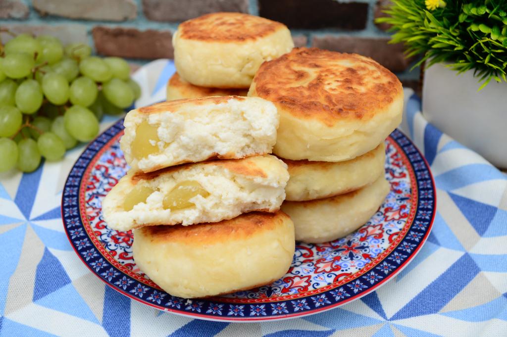 Вкуснейшие сырники с начинкой из винограда можно подавать и тёплыми, и полностью остывшими.