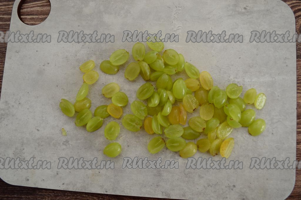 Виноград промыть водой, отделить ягоды от веточек. Разрезать каждую виноградинку в длину на половинки. Если у винограда есть косточки, их обязательно нужно вынуть.
