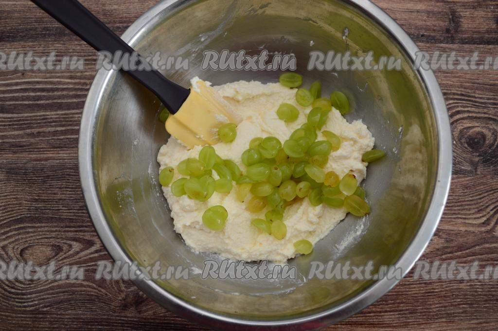 Выложить половинки винограда в миску с творожной массой, перемешать.
