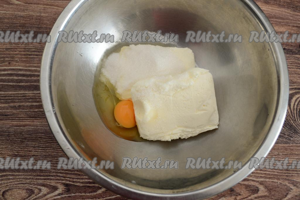 В глубокую миску выложить творог, вбить сырое яйцо, всыпать сахар.
