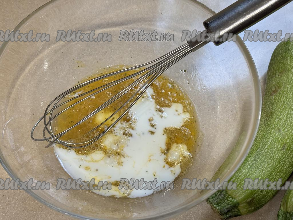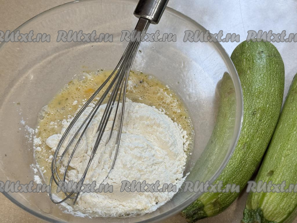 Добавляя муку и хорошо вмешивая её, учитывайте, что кляр должен получиться однородным, в меру густым, напоминающим сметану средней жирности, он в дальнейшем должен легко распределяться по кабачку, но и жидким (стекающим с овощей) он быть не должен.