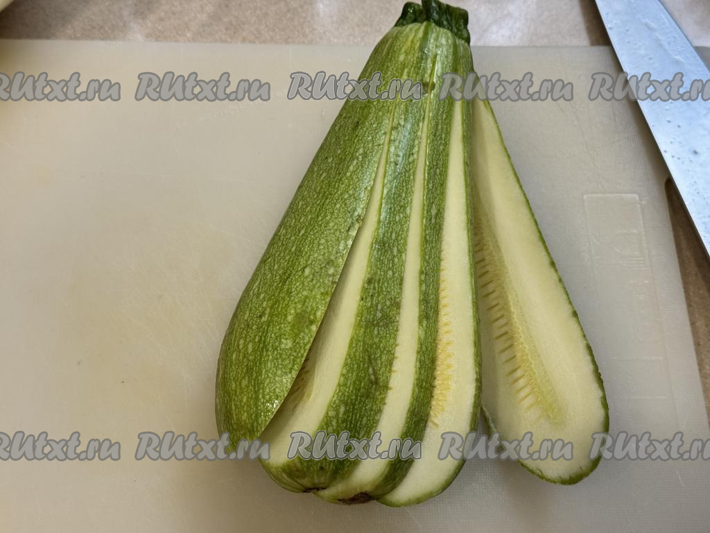 Подготовить продукты. Кабачки вымыть. Для этого блюда нужно брать молодые кабачки с тонкой кожурой и мелкими семечками. Кабачки должны быть такого размера, чтобы они полностью в длину поместились в дальнейшем на сковороде.