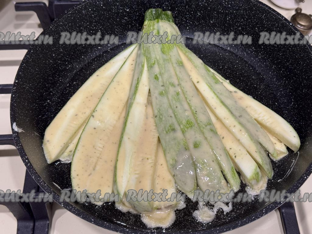 В сковороду достаточно большого диаметра влить растительное масло, разогреть. Выложить веер из кабачка в кляре так, чтобы он полностью помещался в сковороду.