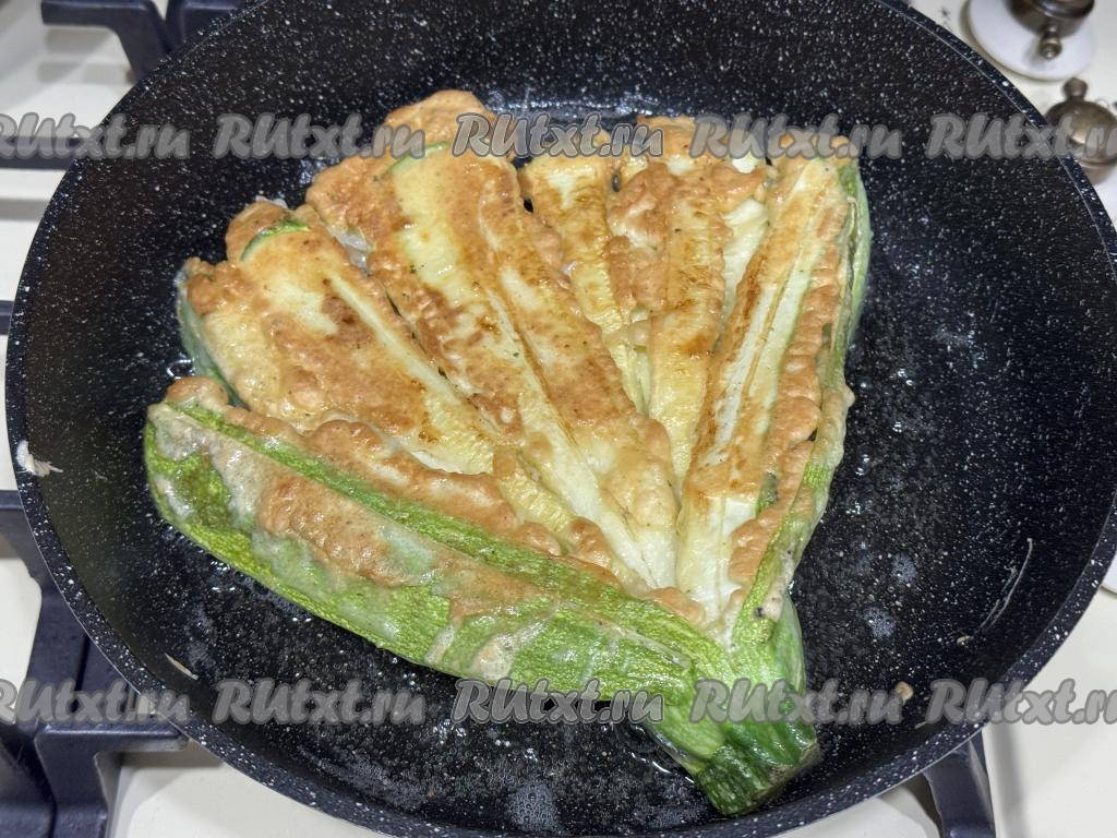 Жарить веер из кабачка на среднем огне с двух сторон до золотистого цвета кляра.