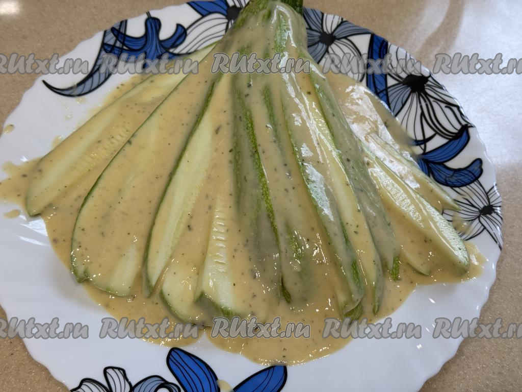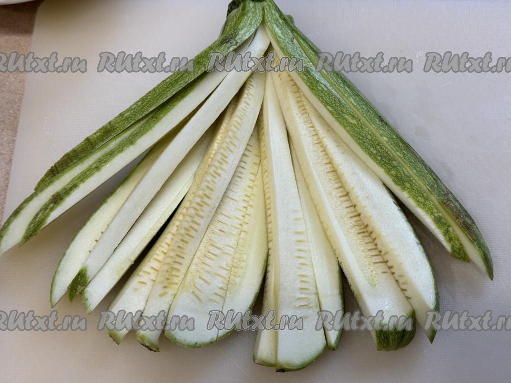 Затем перевернуть кабачок и сделать разрезы, тоже не дорезая до "хвостика". Получится веер из кабачков, напоминающие длинные брусочки "на хвостике", как на фото.