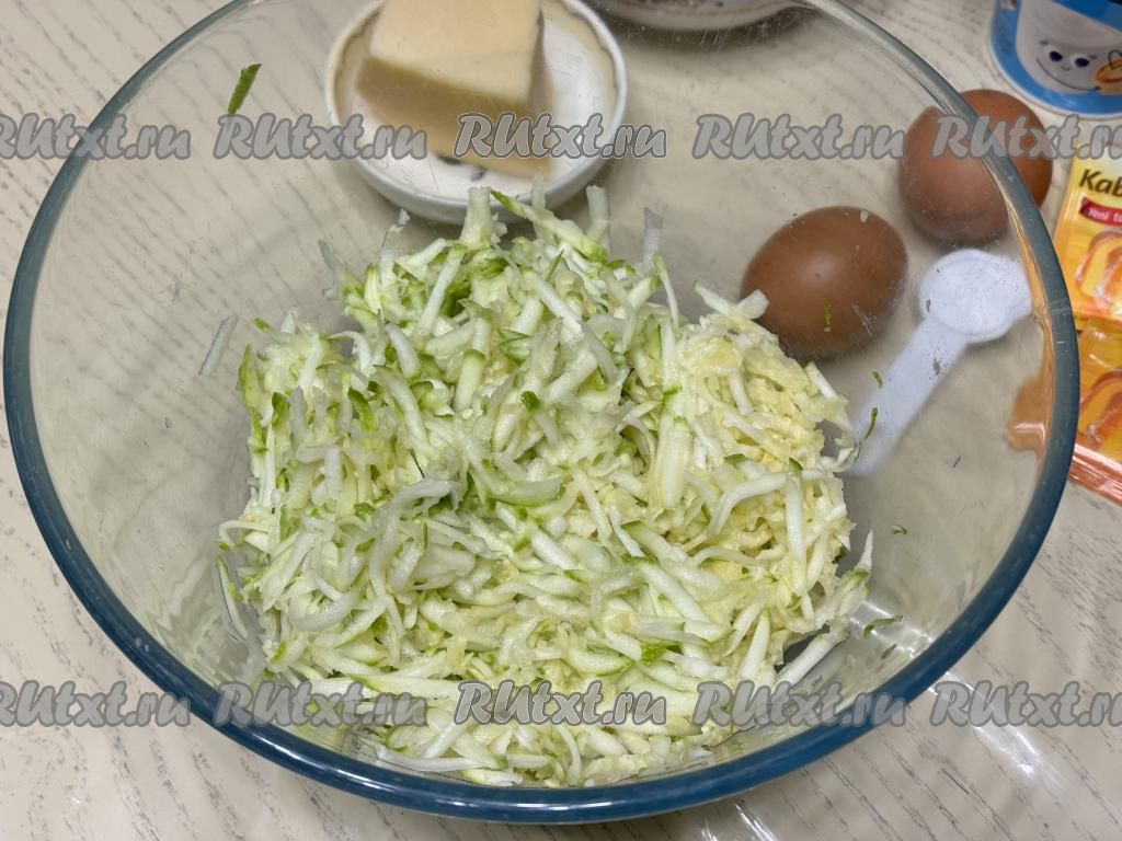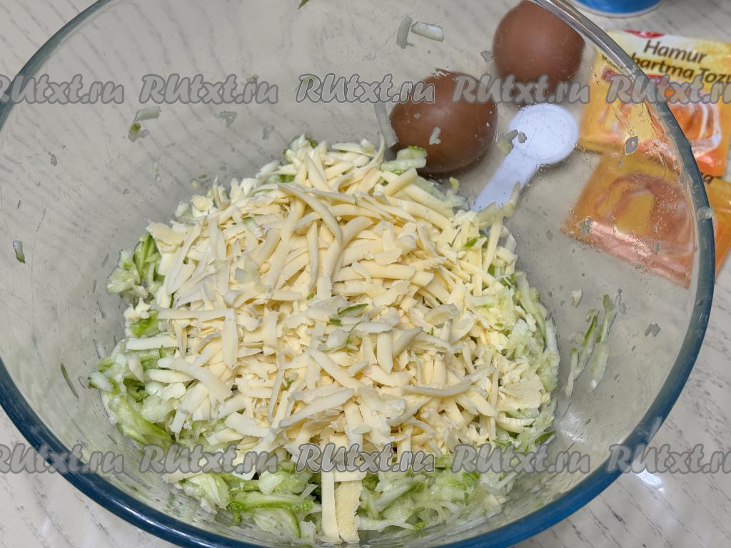 В миску выложить кабачковую массу, отжатую от сока, добавить сыр, натёртый на крупной тёрке.