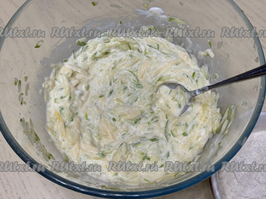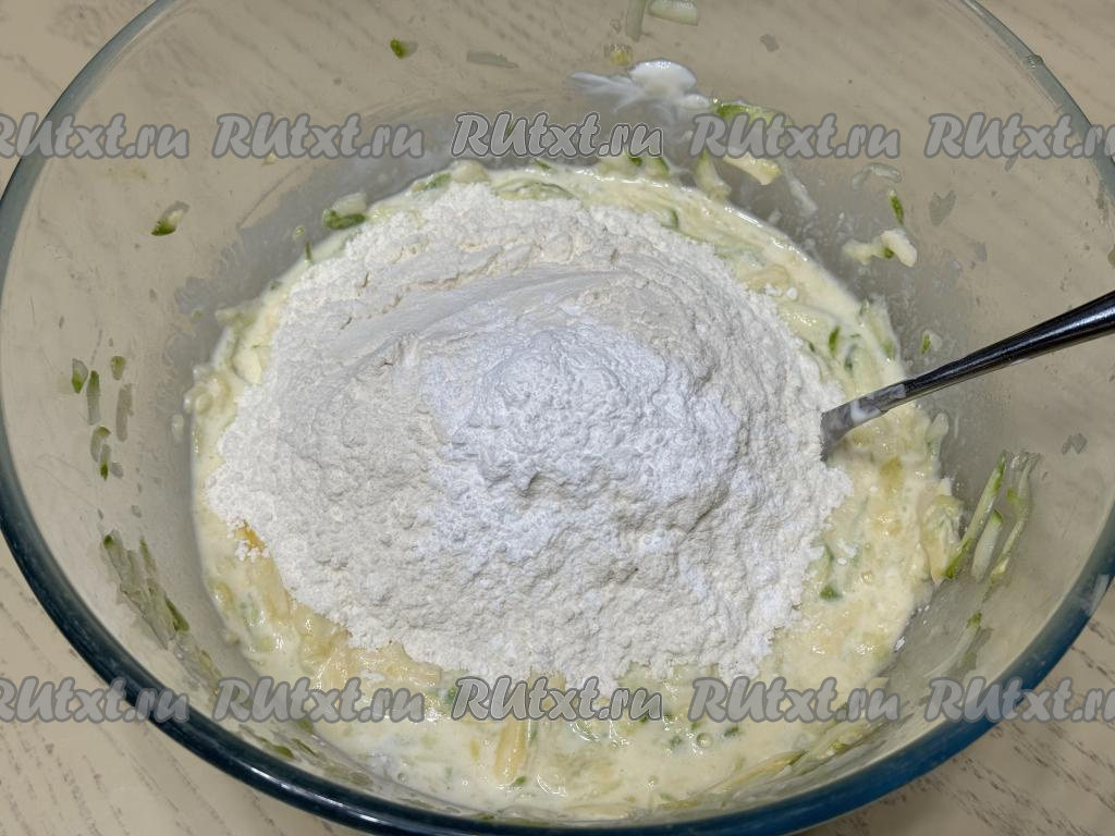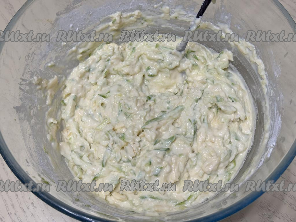 Частями добавляя оставшуюся муку и хорошо вмешивая её, замесить в меру густое кабачковое тесто для запеканки.