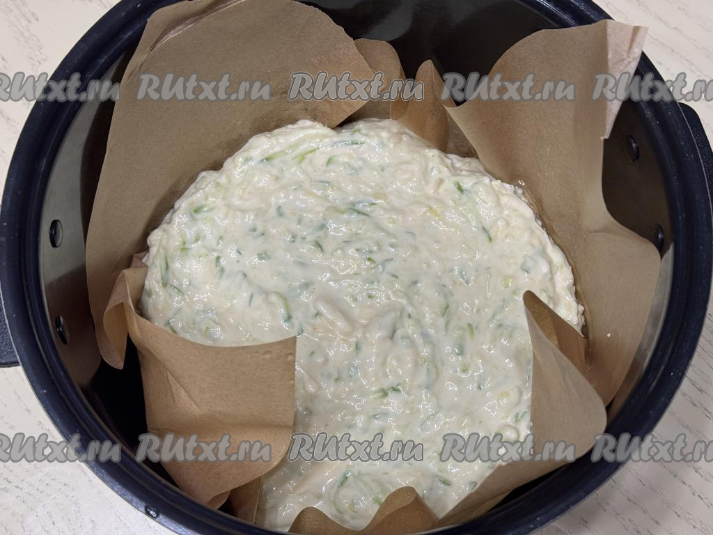 Чашу мультиварки застелить пергаментом так, чтобы он закрывал и бока чаши. Смазать пергамент растительным маслом, выложить тесто, разровнять. Установить чашу в мультиварку. Закрыть крышку, выставить режим "Выпечка" на 1 час 30 минут. Готовить запеканку из кабачков до звукового сигнала.