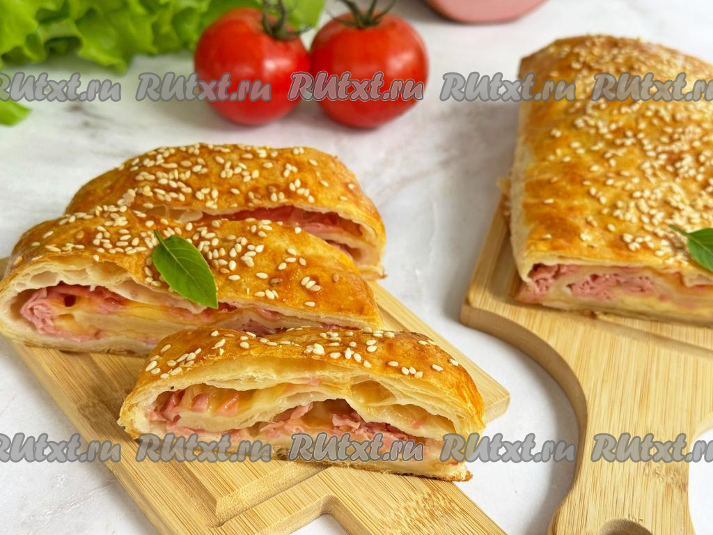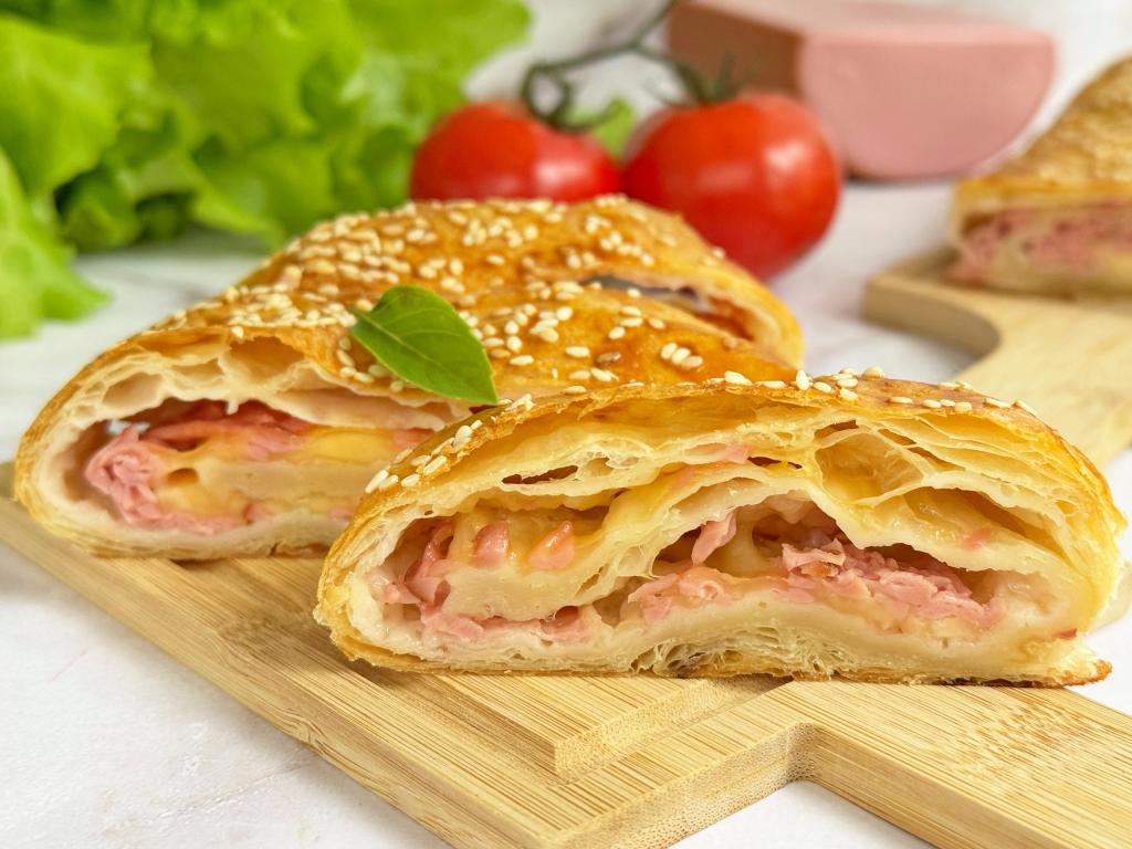 А вот как рулет из воздушного слоёного теста и нежной, аппетитной начинки из сыра и колбасы выглядит в разрезе. Эта вкусная, сытная выпечка станет приятным дополнением и к чаю, и к кофе.