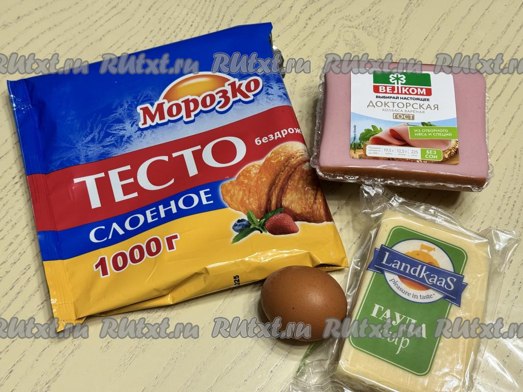 Подготовить продукты. Слоёное тесто можно взять и дрожжевое, и бездрожжевое (у меня - бездрожжевое). Сыр подойдёт любой твёрдых или полутвёрдых сортов.