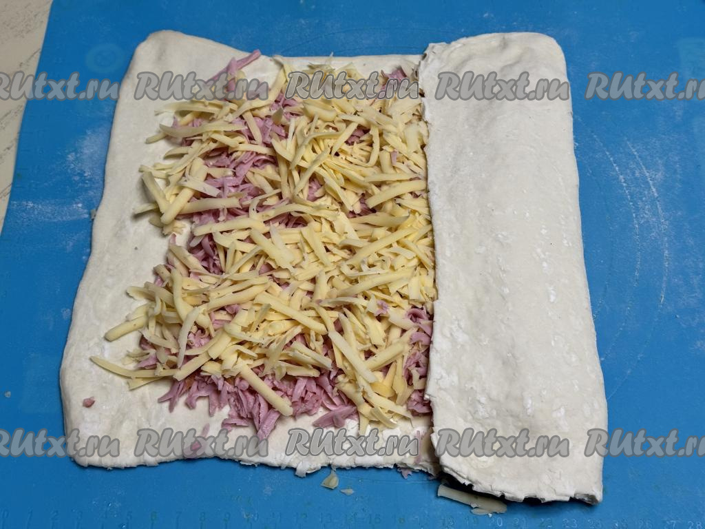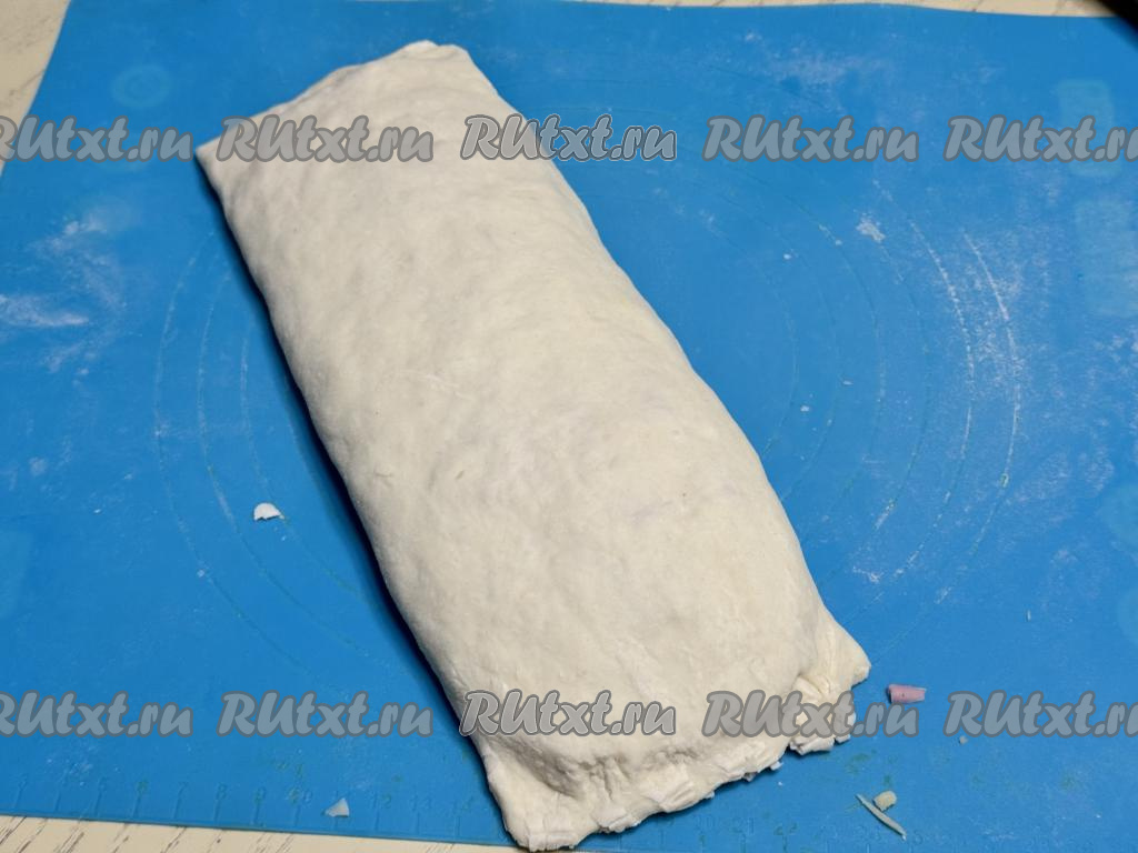 Начиная с узкого края пласта, сделать один заворот теста с начинкой на 1/3 длины (как на фото). Затем сделать ещё два заворота, сформировав плоский рулет.