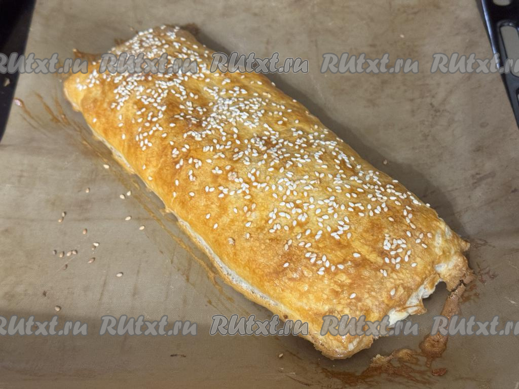 Рулет из слоёного теста с сырно-колбасной начинкой переложить на противень, застеленный ковриком (или пергаментом) для выпечки.