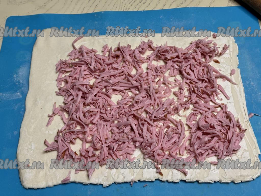 Колбасу натереть на крупной тёрке, затем равномерно выложить на тесто, отступая от краёв теста по 2-3 сантиметра.