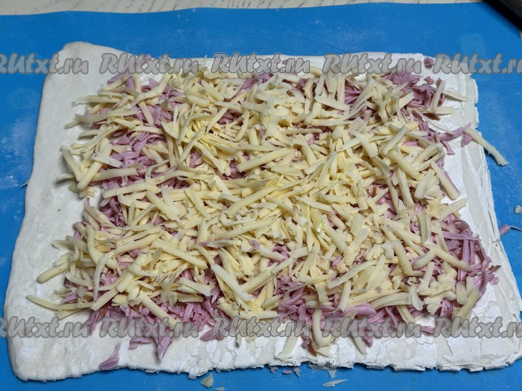 Поверх колбасы равномерно распределить сыр, натёртый на крупной тёрке.