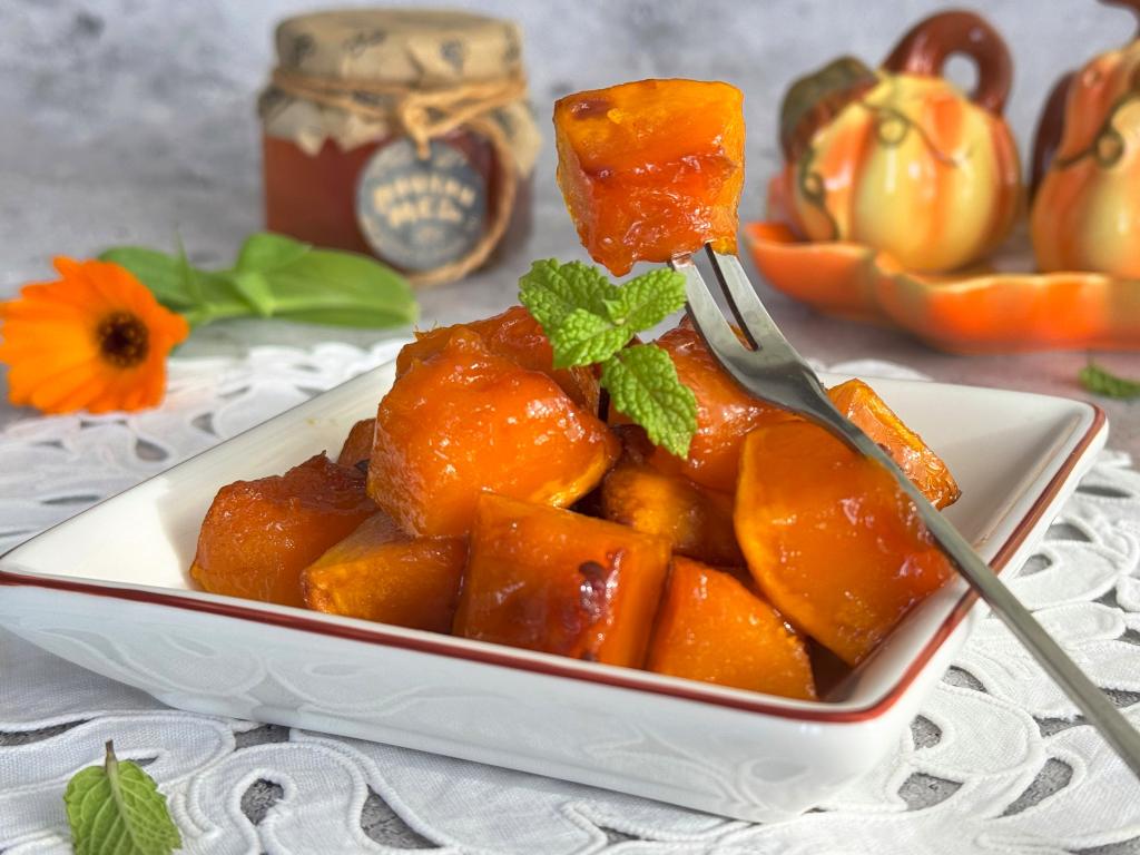 Тыква - яркий, полезный и вкусный овощ, из которого можно приготовить практически любые блюда. В этот раз предлагаю запечь в аэрогриле кусочки тыквы, покрытые мёдом. В результате получается ароматный, аппетитный десерт. В процессе запекания тыква становится полупрозрачной. Мы наивкуснейшую тыкву, запечённую с мёдом, ели с чаем, но её можно добавить и в кашу или творог.