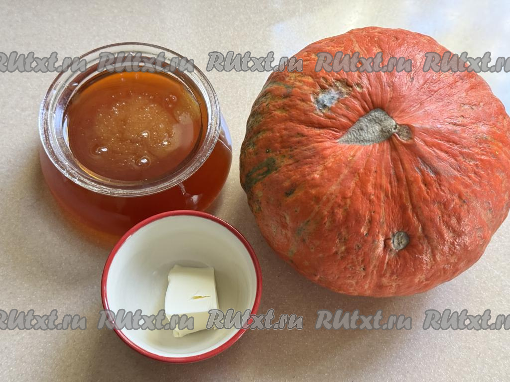 В миску с кусочками тыквы влить мёд и растопленное сливочное масло.