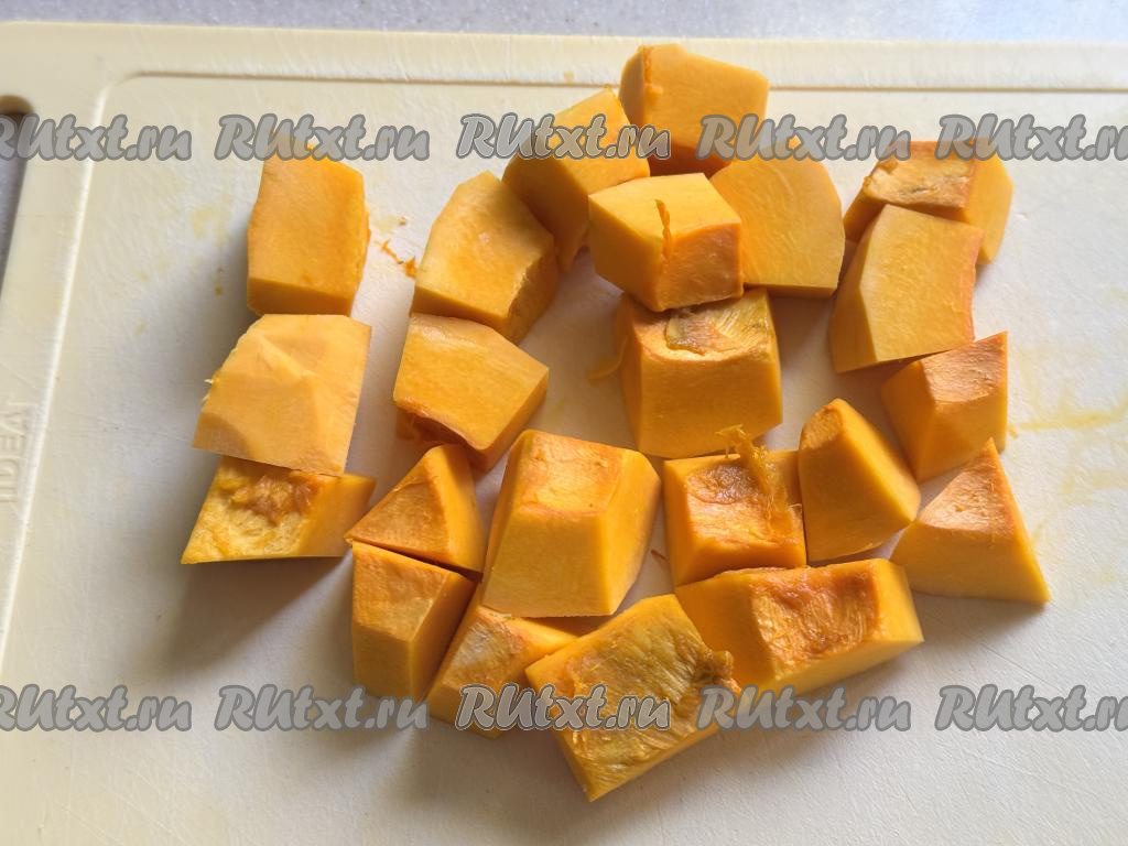 250 грамм тыквы, предварительно очищенной от кожуры, волокон и семечек, нарезать на кубики с размером стороны примерно 1,5 сантиметра.