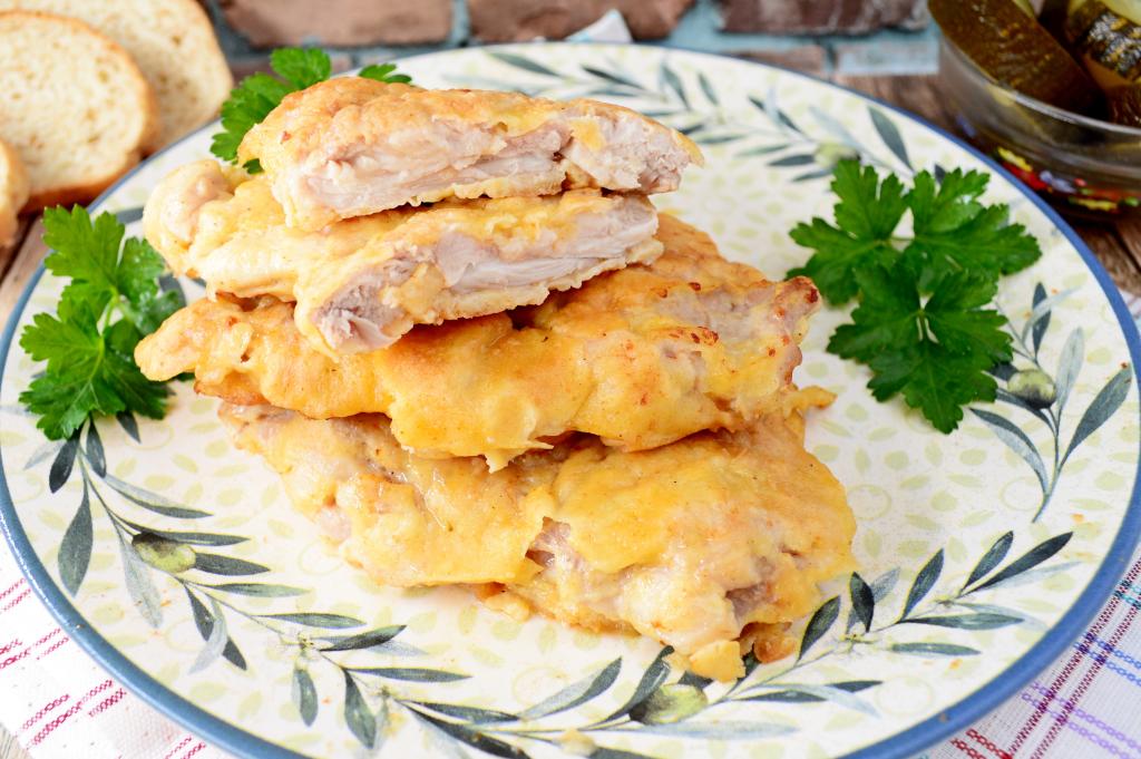 А вот как отбивная из филе бедра выглядит в разрезе. Сочетание сочного, мягкого мяса курицы и нежнейшего золотистого кляра делает это блюдо очень аппетитным и вкусным.