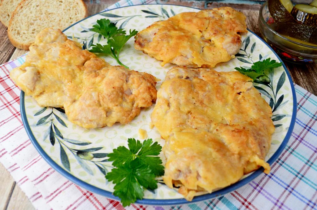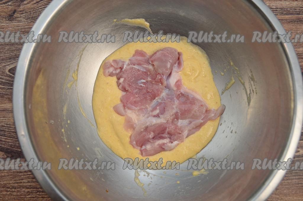 Затем обвалять в кляре со всех сторон все отбивные из филе бёдер курицы.